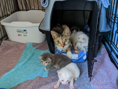 Mom does the best job raising her kittens! When we find nursing kittens and their feral mom, we keep them together until the kittens are weaned. Then if mom hasn't tamed (sometimes they do, like the mom in this picture did!) we spay and vaccinate her and return her to her outdoor home. The kittens go up for adoption as pets.